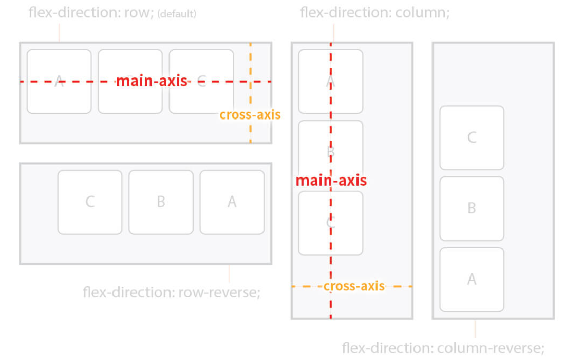 main axis/cross axis를 정의하는 속성값으로 기본 값으로 row로 되어있으며 이때 main axis는 가로축이 설정된다.