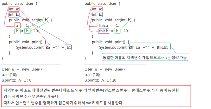 따라서 인스턴스 변수를 명확하게 접근하기 위해서 this키워드를 사용한다.